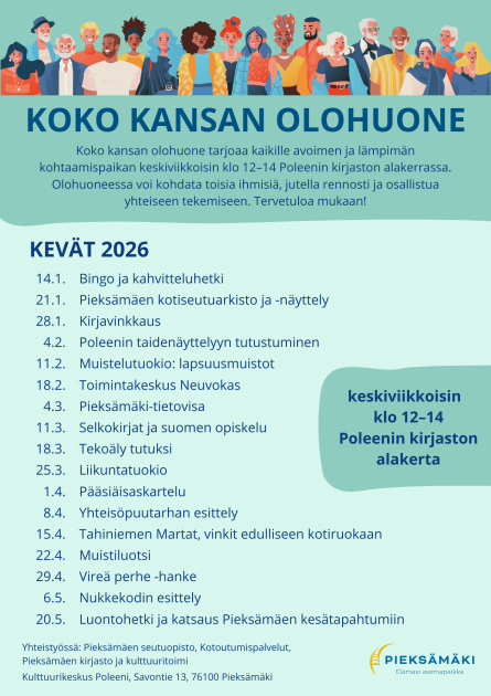 Koko kansan olohuoneen kevätkausi alkaa 14.1.2026. Tapaamme keskiviikkoisin klo 12–14 Poleenin kirjaston alakerrassa.